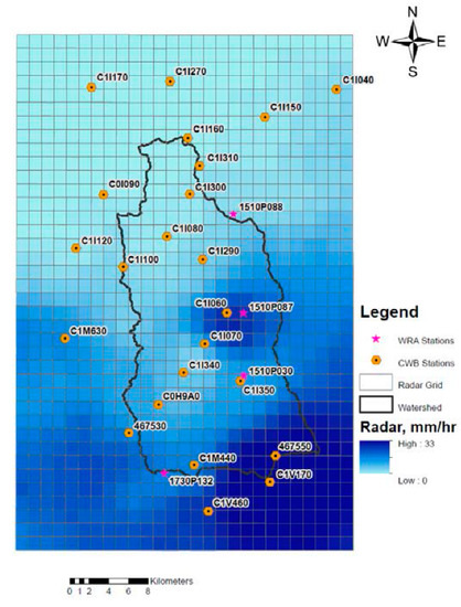 In regard to rainfall recorded at each gauge station, the CWB preprocesses and cumulates the measured rain amount over regular time intervals (10 min and 1 h) for their managed 23 stations. However, the rainfall data collected in the 4 WRA stations were in an irregular time series format. Extra interpolation efforts were carried out to convert the rainfall measurements in WRA stations into a regular time series format that was consistent with the data from the CWB, including time interval and time stamp format. Then, the regular time series of the rainfall data from all gauge stations could be used directly by the rain field interpolation algorithm developed in this study.