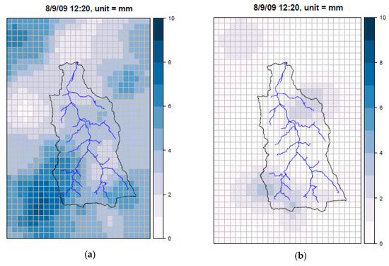 Among all the required inputs for runoff modeling, rainfall data undoubtedly have the most critical influence on the prediction results. In order to fulfill the requirement of high-resolution input data for distributed simulations, dense gauge networks must be built to observe the actual spatial distribution of rainfall. However, establishing dense gauge networks, especially in mountainous regions, is impractical due to the high cost of instrumentation and required routine maintenance services [11,12]. In addition, geographical constraints such as highly sloped terrain also limit the number and placement of gauges within a network. Rainfall values over the ungauged regions are generally estimated through spatial interpolation. As indicated by Duncan et al. [13], the interpolated results were heavily dependent on rain gauge network density. Regardless which interpolation technique is chosen, the technique can easily misrepresent the overall rainfall distribution due to undersampling if the number of stations is insufficient. Sampling errors produced from rain gauge networks with various densities have also been investigated by other researchers [13,14,15,16].
