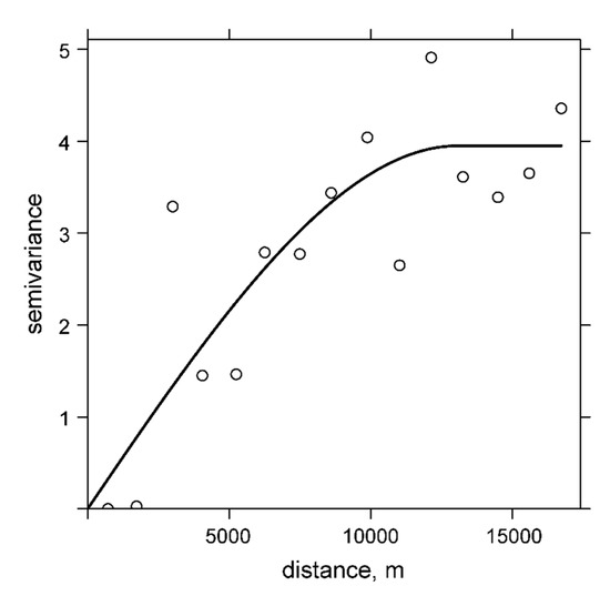 Here, = the magnitude of the regional variable (or the residual); = the magnitude of the regional variable that is away from by a distance of h; = SV function; and = the number of pairs of residual variables separated by h. A semivariogram can be generated by plotting semivariances versus distances between ordered data. Figure 5 shows an example of a semivariogram. It should be noted that strong similarities exist between the residuals at shorter distances, as the semivariance decreases with the decreasing distance between gauge stations.