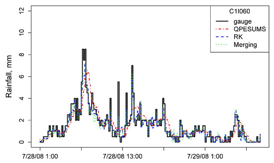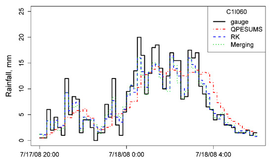 The time variations in rainfall depth (hyetographs) at station C1I060 showing the adjusted event rainfall values from RK and merging, the original QPESUMS data, and the gauge measurements for Typhoon Kalmaegi are presented in Figure 6. It can be seen in Figure 6 that the QPESUMS data do not follow the measurements closely and tend to underestimate the local rainfall peaks and overestimate the rainfall values in the recession limb of the event. In contrast, the interpolated rainfall values of the proposed RK and merging methods follow the gauge measurements more closely (capturing the peaks and troughs).