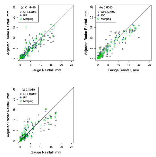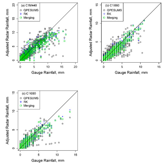 To better the comparisons of the performances of the RK and merging methods, all the interpolated rainfall values and unadjusted QPESUMS data for the event of Typhoon Morakot are plotted against the gauge measurements in Figure 9a–c for stations C1M440, C1I060, and C1I080, respectively. The 45-degree reference line represents the perfect agreement. As shown in Figure 9a–c, the data points of the rainfall values corrected by the spatial interpolation algorithms of RK and merging scatter around the reference line more closely than those of the QPESUMS data. The plots also support the statement made above that the adjusted radar rainfall values at station C1I060 among the three test stations are shown to have the best agreement with the gauge data.