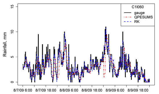 The hyetographs covering the event period of Typhoon Morakot at station C1I060 are shown in Figure 8. The plots include the interpolated results from the RK and merging methods. Observations from the gauges and the unadjusted QPESUMS radar estimates are also plotted for comparison. It can be clearly seen that the unadjusted QPESUMS data show poor representation of the real-time varying rainfall values. The adjustment procedure from RK is shown to be able to substantially improve the radar data to fit closely to the gauge measurements, especially within the period from midnight to 1:00 a.m. on 9 August 2009.