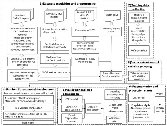 The CCEF model was based on freely available satellite images and geospatial data sets. An overview of the methodological design is illustrated in Figure 2. The approach was divided into six phases: (1) Data sets’ acquisition and preprocessing, (2) training data collection, (3) value extraction and variable grouping, (4) random forest model development, (5) validation and map comparison, and (6) fragmentation and protection status. The sections below describe the phases in more detail.