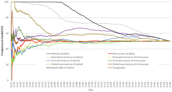 Frequency of variable groups used in the 1023 models ranked against the True Skill Statistic (TSS). Each variable group was used in 512 models and, thus, the frequency of each variable group converged to 50% when all models were considered. Seasonality, descriptive texture of optical, and topography were most frequently used in the best models (highest TSS) while microwave variables, orderliness, and contrast texture of optical groups were less frequent in the best models. All the models were built with default parameters (ntree = 500, mtry n/3).