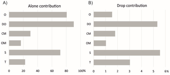 Alone (A) and drop (B) contributions of the variable groups in the best model proportioned against the TSS. O (optical), DO (descriptive texture of optical), CM (contrast texture of microwave), OM (orderliness texture of microwave), S (seasonality), and T (topography).