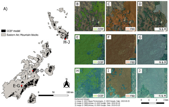 Highlighted features of CCEF model (A) compared with the forest map of Forestry and Beekeebing Division (FBD) [45] (center), and Newmark and McNeally [39] (right) in 1:80,000 scale. Figures (B–D) illustrate the potential of the products for accurate small forest fragment detection, figures (E–G) illustrate the potential to detect gaps of open or sparsely forested areas within large fragments, and figures (H–J) illustrate the gaps in the CCEF model caused by persistent cloud cover.