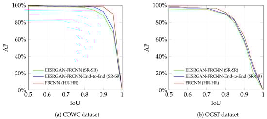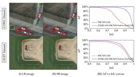Detection on LR (low-resolution) images (60 cm/pixel) is shown in (I); in (II), we show the detection on generated SR (super-resolution) images (15 cm/pixel). The first row of this figure represents the COWC (car overhead with context) dataset [31], and the second row represents the OGST (oil and gas storage tank) dataset [32]. AP (average precision) values versus different IoU (intersection over union) values for the LR test set and generated SR images from the LR images are shown in (III) for both the datasets. We use FRCNN (faster region-based CNN) detector on LR images for detection. Then instead of using LR images directly, we use our proposed end-to-end EESRGAN (edge-enhanced SRGAN) and FRCNN architecture (EESRGAN-FRCNN) to generate SR images and simultaneously detect objects from the SR images. The red bounding boxes represent true positives, and yellow bounding boxes represent false negatives. IoU = 0.75 is used for detection.