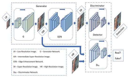 The SR network has three components: generator (G), discriminator (), and edge-enhancement network (EEN). Our method uses end-to-end training as the gradient of the detection loss from the dectector is backpropagated into the generator. Therefore, the detector also works like a discriminator and encourages the generator G to generate realistic images similar to the ground truth. Our entire network structure can also be divided into two parts: A generator consisting of the EEN and a discriminator, which includes the and the detector network. In Figure 2, we show the role of the detector as a discriminator.