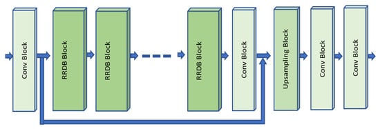 We use the generator architecture from ESRGAN [21], where all batch normalization (BN) layers are removed, and RRDB is used. The overall architecture of generator G is shown in Figure 3, and the RRDB is depicted in Figure 4.