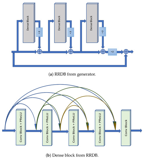 We use RRDB as the basic blocks of the generator network G that uses a multi-level residual network with dense connections. Those dense connections increase network capacity, and we also use residual scaling to prevent unstable conditions during the training phase [21]. We use the parametric rectified linear unit (PReLU) [38] for the dense blocks to learn the parameter with the other neural network parameters. As discriminator (), we employ a relativistic average discriminator similar to the work represented in [21].