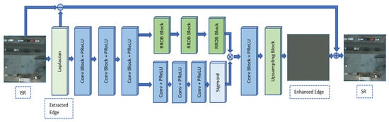 The EEN network removes noise and enhances the extracted edges from an image. An overview of the network is depicted in Figure 5. In the beginning, Laplacian operator [28] is used to extract edges from the input image. After the edge information is extracted, it is passed through convolutional, RRDB, and upsampling blocks. There is a mask branch with sigmoid activation to remove edge noise as described in [22]. Finally, the enhanced edges are added to the input images where the edges extracted by the Laplacian operator were subtracted.