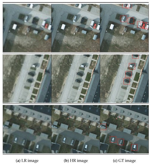 COWC (car overhead with context) dataset: LR-HR (low-resolution and high-resolution) image pairs are shown in (a,b) and GT (ground truth) images with bounding boxes for cars are in (c).