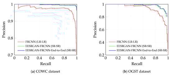 In the training process, the learning rate was set to 0.0001 and halved after every 50 K iterations. The batch size was set to 5. We used Adam [64] as optimizer with , and updated the whole architecture weights until convergence. We used 23 RRDB blocks for the generator G and five RRDB blocks for the EEN network. We implemented our architecture with the PyTorch framework [65] and trained/tested using two NVIDIA Titan X GPUs. The end-to-end training with COWC took 96 h for 200 epochs. The average inference speed using faster R-CNN was approximately four images/second and seven images/second for SSD. Our implementation can be found in GitHub [66].