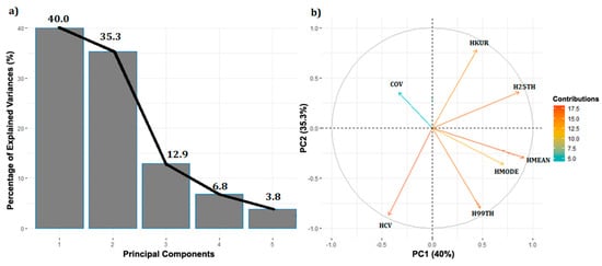 (a) The percentage of variance explained by the five PCs. (b) Projection of the first two PC scores from the selected LiDAR metrics. Different colors represent the variable contribution.