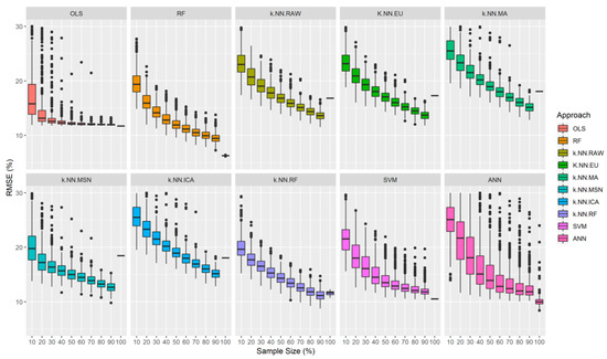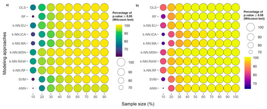 Considering each tested modeling approach, to assess how the combined effect with sample size may impact the accuracy of the predictions, we used the Wilcoxon–Mann–Whitney test to determine if the differences between the methods and sample sizes were statistically significant (at p-value = 0.05). We developed all the statistical analyses in the R statistical package [46]. The RF algorithm was implemented by package randomForest [47], k-NN by yaImpute package [48], in combination with the randomForest package [47], the SVM by the e1071 package [49], and the ANN was implemented by the nnet package [50].