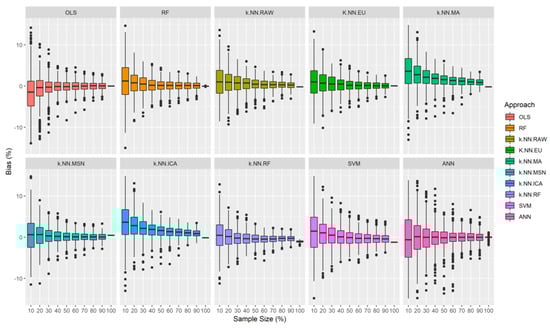 From our results, it was evident that algorithm performance was sensitive to sampling size and the level of influence varied from one algorithm to another. On placing constraints (<15%) for RMSE values, only 4 models—SVM, RF-based k-NN, RF, and OLS—were found to be feasible for making predictions for 50% (or less) of the sample size. In the case of OLS and RF, a sample size greater than 30% fell within the RMSE threshold. For OLS, this might be because of the low level of multicollinearity within the model. Whereas, for RF-based k-NN and SVM, the ideal sample sizes were equal to or above 50%. In terms of bias, we noticed that all the models fell within the maximum set limit, which was 15%. With respect to R2 values, OLS proved to be the best among the given modeling methods, followed by RF, when minimal sample size was given priority. The range of R2 values was comparatively stable for OLS: 0.82–0.85 for 30% to 90%; however, RF: 0.80–0.91 for 30% to 90%, reached higher values when the sample size was increased. The increase in R2 values with increasing sample size was very evident in the case of other non-parametric models as well. However, this pattern was expected, considering the fact that the non-parametric models learn their functional form from the training data [52,58], which means that the higher the sample size, the better their prediction accuracy will be. This dependence on sample size might be the reason several other non-parametric algorithms failed to provide satisfactory results in our case, where field plots considered were limited [20,59].