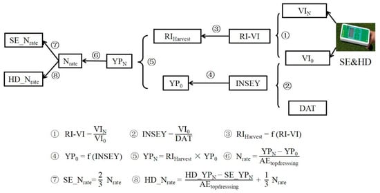 RapidSCAN sensor-based in-season N recommendation algorithm developed for determining topdressing N rates at stem elongation stage and heading stage of high-yielding rice in this study. VIN: vegetation index at plots with sufficient N fertilization plots; VI0: vegetation index at plots without additional N topdressing application; RI-VI: in-season N response index based on vegetation index; RIHarvest: N response index based on yield; DAT: the number of days from planting to the date of sensing; INSEY: in-season estimate of yield; YP0: the potential yield without additional topdressing N application; Nrate: recommended topdressing N application rate at stem elongation stage; AEtopdressing: agronomic efficiency of topdressing N; SE_YPN or HD_YPN: the potential yield with added topdressing N application at the stem elongation stage or heading stage, respectively; SE_Nrate or HD_Nrate: recommended topdressing N application rate at the stem elongation stage or heading stage, respectively.