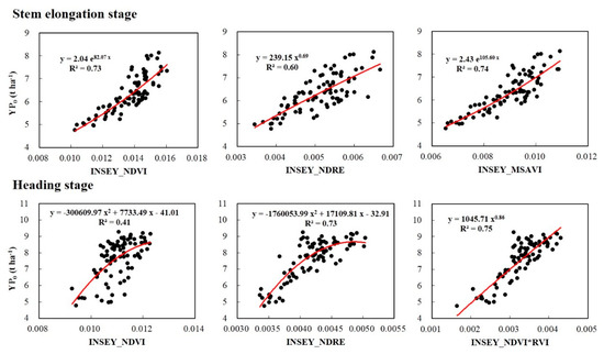 At the heading stage, however, INSEY_NDVI did not perform very well, explaining only 28-59% of the YP0 variability. Moreover, INSEY_NDRE performed consistently better than INSEY_NDVI, explaining 73–89% of the YP0 variability (Table 4). The INSEY calculated with red edge optimal soil adjusted vegetation index (REOSAVI) (INSEY_REOSAVI), modified red edge soil adjusted vegetation index (MRESAVI) (INSEY_MRESAVI), and NDVI*RVI (INSEY_NDVI*RVI), did not perform significantly better than INSEY_NDRE (Table 4). Furthermore, the YP0 was better estimated using INSEY for Longjing 31 than for Longjing 21.