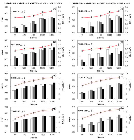 Rice yield without additional topdressing N application (YP0) or NDVI (a; c; e; g) and YP0 or NDRE (b; d; f; h) obtained by RapidSCAN at the stem elongation (a–d) and heading (e–h) stages as affected by different N rates for Longjing 31 (a; b; e; f) and Longjing 21 (c; d; g; h) in 2014–2016, respectively. Different color bars represent the value of NDVI or NDRE in different years. Different dots represent YP0 in different years. The red curves were the curves of rice yield potential without additional topdressing N application (YP0). Vertical bars represent the LSD value (p = 0.05) among different N levels.