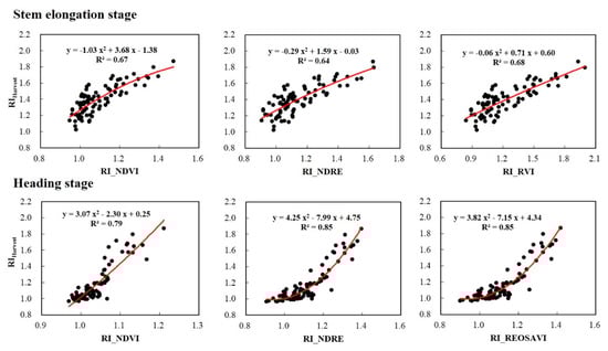 At the heading stage, RI_NDRE and RI calculated with best performing VIs (normalized NIR index (RI_NNIRI), red edge optimal VI (RI_REVIopt), REOSAVI (RI_REOSAVI)) performed similarly for the prediction of RIHarvest (Table 5). They worked better than RI_NDVI (R2 = 0.79–0.85 vs. R2 = 0.67–0.79) for Longjing 21 or across varieties based on the calibration results. However, they performed similarly for Longjing 31 (R2 = 0.92–0.95). With validation, RI_NDRE (R2 = 0.75–0.82, RMSE = 0.10 and REr = 8.3–8.7) and RI calculated with best performing VIs (R2 = 0.73–0.82, RMSE = 0.10 and REr = 8.3–8.7) were better than RI_NDVI (R2 = 0.60–0.65, RMSE = 0.12–0.16 and REr = 10.2–13.4) for a specific variety or across varieties (Table 5). The RI calculated with best performing VIs performed better at the heading stage than the stem elongation stage for either calibration or validation.