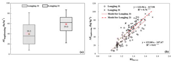 The difference in AEtopdressing between Longjing 31 and Longjing 21 (a) and its relationship with RIHarvest (b). The red ✳ indicates the average of AEtopdressing in Figure 5a. The red lines are the different regression models for Longjing 31 and Longjing 21 in Figure 5b; *** indicates significance at the level of p < 0.001.