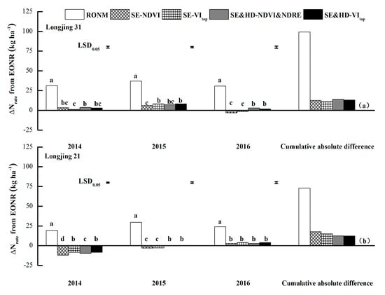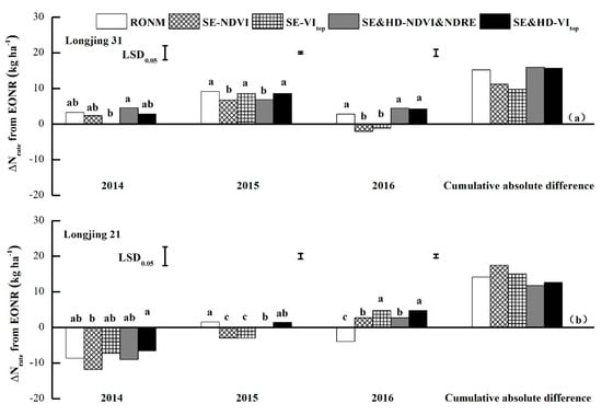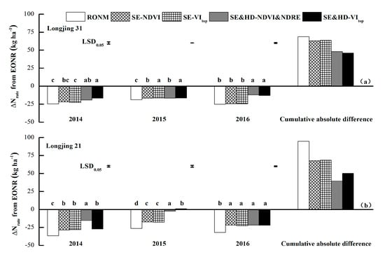 The difference of recommended topdressing N application rate (ΔNrate) from economically optimal N rates (EONR) between RONM strategy and RapidSCAN sensor-based PNM strategies for the rice varieties of Longjing 31 (a) and Longjing 21 (b) under optimal N status before topdressing (N120) in 2014–2016. RONM: the regional optimum N management topdressing N rate (36 kg N ha−1 in this study). SE-NDVI and SE-VItop indicated recommended topdressing N application rates calculated by the models using NDVI and the top performing VIs (VItop) for different varieties at stem elongation stage, respectively. SE&HD-NDVI&NDRE and SE&HD-VItop indicated recommended topdressing N application rates calculated by the models using NDVI (at stem elongation stage) and NDRE (at heading stage), and VItop at stem elongation and heading stage, respectively. Vertical bars represent the LSD value (p = 0.05). Different letters indicate significant difference at p < 0.05 level within the same year.