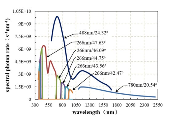 Equation (2) decides the efficiency of SPDC, as well as exit angles and polarizations of correlated photons. By means of fine adjustment of incident angle, polarization of laser beam, and optical axis direction and birefringence properties of the crystal, correlated photons generated along the laser path inside the crystal will have the same phase when exiting the crystal. This phase matching condition needs an iterative optimization to balance down-conversion efficiency, spectral range and exit angles of correlated photons. As a consequence, only a limited spectral range, typically a few tens to a few hundred nanometers, is usable for a certain laser-crystal configuration. In order to cover a spectrum of 380–2500 nm for calibration of solar observing detectors, seven barium metaborate, β-BaB2O4), (BBO) crystals pumped by lasers of three wavelengths generate correlated photons with required spectral rates, polarization and exit angles, as shown in Figure 2. BBO is an optical crystal with high nonlinear coefficient and transmittance at 190–3500 nm and widely used as a media for optical frequency conversion.