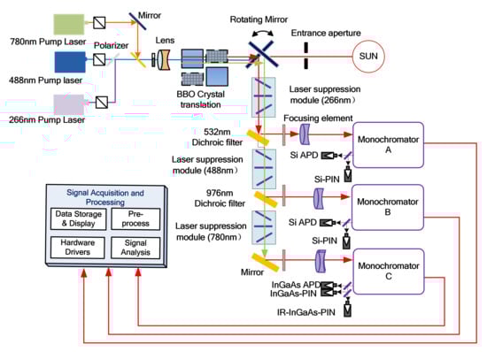 Crystals are installed in a temperature stabilized container and translated by an electric motor to match laser and crystal with specified phase-matching conditions. Correlated photons are directed by a rotating mirror into middle optics before finally reaching Si and InGaAs avalanche photodiodes (APDs). In middle optics, band-pass filters suppress residual pump photons by about 9 orders of magnitude. The laser suppression modules are designed for "long pass". The first suppression module blocks light below a threshold wavelength, e.g., 350 nm in the current system, so the pumping beam of 266 nm is removed, and correlated photons with wavelength > 350 nm pass through. Similarly, the second suppression module removes residual pumping photons of 488 nm, and the third 780 nm. In each suppression module correlated photons with wavelength > threshold wavelength will pass through. Beam splitters separate correlated photon pairs and direct them into two monochromators with wavelengths settings satisfying Equation (1). Spectral resolution is currently configured as 3 nm for 380–1000 nm and 8 nm for 1000–2500 nm spectrum, respectively.