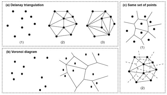 Delanay triangulation (DT) and the Voronoi diagram. (a) Delanay triangulation; (b) Voronoi diagram; (c) Same set of points.