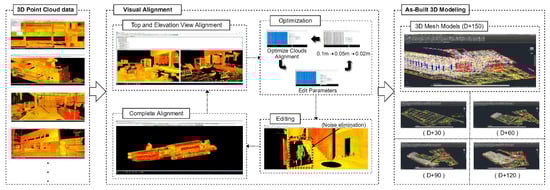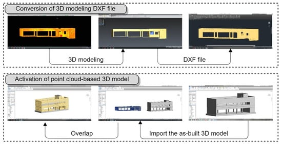 The BIM modeling tool used in this study was Autodesk Revit software, which used the platform to compare the progress of as-planned and as-built data. Clear planning criteria are needed to compare the performance against the plan through the collection of as-built data. In this study, the period-specific BIM model generated based on the start and end dates of construction elements was used as the as-planned data of the project, and the 3D model generated based on the 3D point cloud was used as the as-built data. For this comparison, the 3D mesh model created based on the 3D point cloud should be imported into the BIM model. However, the two types of 3D models have different operating software bases and therefore must be imported through file conversion. The process for performing this task is presented in Figure 2.