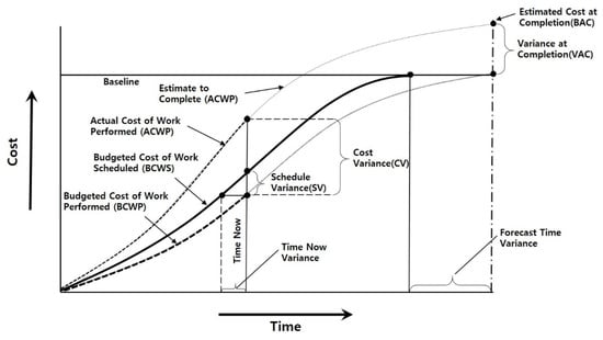 The Earned Value Management System (EVMS) measures the actual progress of the project and allows project risk assessment by considering time and cost [41]. The proposed process in this study evaluated the integrity of the project based on the EVMS. Integrity evaluation of the project was based on planned EV, project EV, and actual EV items, and a variance and performance index were used for the analysis (Figure 3). Variance analysis is related to schedule and cost, and the performance index can be categorized into the Schedule Performance Index (SPI) and Cost Performance Index (CPI).