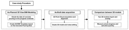 In this study, the scope of the application of as-built data was limited to the frame construction in the construction project. This is because the main tasks of framing frame construction are steelwork and formwork, which require a large workforce, and these tasks are typically the main types of jobs that delay an entire construction project period. The collection period of as-built data lasted until the 10 divisions of the construction site were matched, and the use of collected as-built data lasted until the concrete deposition was completed. Typical types of framing construction work can be classified into reinforcing bars, formwork, and depositing concrete, and it is determined that frame structures are created if the concrete deposition is completed. However, the formwork and reinforcing bar tasks can be collected in the as-built data, which was acquired during the 3D point cloud data collection. Therefore, in the present study, the data were classified as noise to perform the editing operation. The procedure for the case study is illustrated in Figure 4.