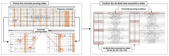 For the baseline plan of this study, the collection date of the as-built data was confirmed based on the concrete deposition date, according to the progress schedule, and the collection period was limited to five months, which was the time period from the start date of the actual concrete deposition after the commencement of construction to the time when the divided districts were matched. Figure 5 presents the dates when the as-built data were confirmed and collected based on the progress schedule and the collection plan of the as-built data, in which the data were collected five times at 30-d intervals from the start date of the first deposition.