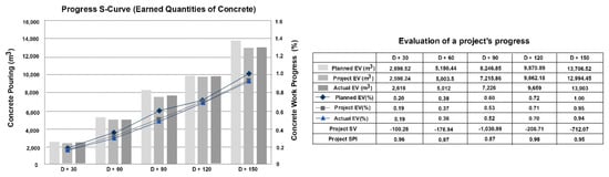 Figure 9 is based on the progress data of the case study site, and the evaluation was conducted based on planned EV, project EV, and actual EV. The planned EV indicates the quantity of as-planned concrete deposition, the project EV indicates the quantity of as-built data-based deposition, and the actual EV indicates the quantity based on the ready-mixed concrete deposition. The case study was conducted based on the analysis of the variance and performance index, and the results are as follows.