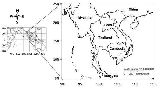 Map of the Indochina Peninsula (5°–25°N, 90°–115°E).
