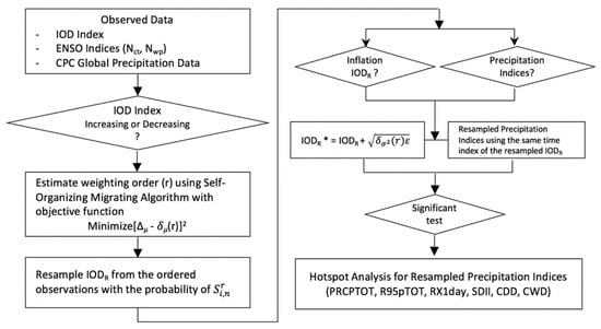 If the average value of increase or decrease is given as , then the weight “” can be calculated accordingly. In this study, the selection of the weight sequence was performed using a Self-Organizing Migrating Algorithm with the objective function to minimize . This approach follows a past study of extreme droughts during spring (March–May) in the Indochina peninsula []; however, no climate change indices for both the wet season (May–October) and the dry season (November–April) were integrated in that study, taking into account both the dipole mode in the tropical Indian Ocean and SST warming in the Pacific Ocean. In addition, the IBB technique was employed to generate resampled datasets for the IOD and the response to the intensity and frequency of rainfall in order to identify IOD-sensitive hotspots over the ICP. The statistical significance of the analysis results was assessed using the significance level of the 95th percentile.