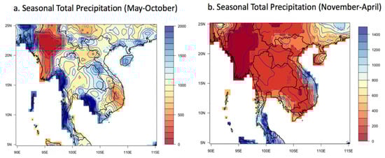 Figure 4 shows the seasonal average precipitation during the wet and dry seasons across the ICP region during 1979–2018. The total precipitation during the wet season across the ICP is about 1000–1500 mm. In addition, it has been confirmed that precipitation variability is dependent on specific regions (Figure 4a). The precipitation variability was found to differ significantly between inland (<1000 mm) and coastal areas (>2000 mm). Precipitation on the western coast of Cambodia, the coast of western Thailand, and Myanmar during June–November is attributable to the influence of the southwest and southeast monsoons. Moreover, a clear difference in precipitation is evident between eastern and western parts of the Arakan Mountains in Myanmar. As water vapor from Bangorman decreases over the mountains, the Arakan Mountains show an arid climate to the east and a pattern of strong precipitation to the west.
