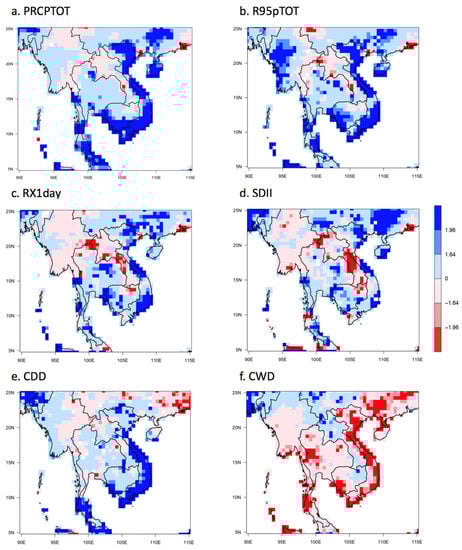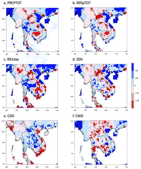 Long-term trend in seasonal precipitation for the dry season (November–April) over the ICP during 1979–2018. (a–f) show the analysis results of the six major climate change indices that reflect the magnitude and frequency of precipitation. In each panel, positive and negative trends are displayed in blue and red, respectively. The magnitude of Z is associated with the significance level, i.e., |Z| > 1.64 is for the 10% significance level and |Z| > 1.96 is for the 5% significance level.