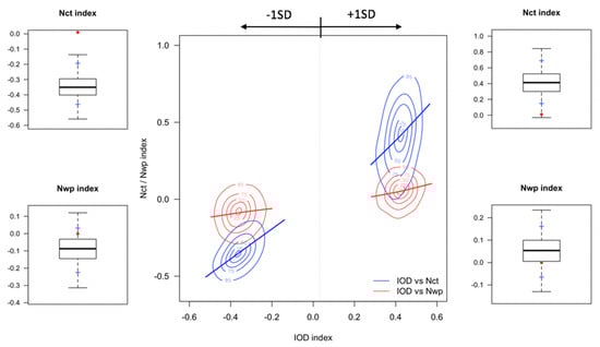 Mean differences of the two types of El Niño with ±1 SD of the IOD. In the main panel, contours (5th, lower quadrant, median, upper volatile, and 95th level) summarize the IOD index and CT El Niño (NCT) or WP El Niño (NWP) index using the intentionally biased bootstrapping model. Both left and right panels deliberately apply ±1 SD of the IOD to show results of 1000 simulations for the NCT and NWP indices. Red dots in each panel represent the average value of the observations.