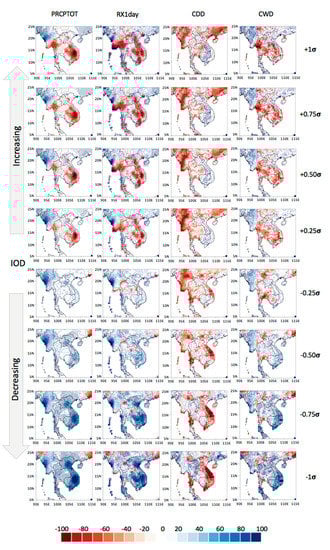 Given the condition of increases or decreases by 0.25 SD of the IOD index for the dry season, the spatial distribution of the rainfall indices is shown in Figure 11. For a decrease of −1 SD of the IOD, there is more rainfall (PRCPTOT and RX1day) than usual throughout the ICP, especially in Laos and Vietnam. For a +1 SD increase of the IOD, negative anomaly patterns of PRCPTOT are dominant in southern Vietnam, eastern Cambodia, and northeastern Thailand, while weak patterns of positive anomaly are evident in areas of Myanmar and South China. Compared with the changes in the rainfall indices during the wet season, changes in the rainfall indices are intensified and the spatial influence is more extensive. However, for the CDD and CWD indices, either the positive anomaly patterns are weakened or the negative anomaly patterns appear for a +1 SD increase of the IOD. Especially for the CWD index, a pattern of decrease by more than 10–20% compared with the long-term average is found in Thailand, whereas the Myanmar region shows a pattern of increase of 15–25%. In this study, we simulated the changes in both wet and dry season rainfall across the ICP according to intentional IOD changes, and IOD-sensitive hotspots were verified through quantitative analysis. The findings of this study could help elucidate the long-term changes in rainfall expected in the ICP region in a changing climate.