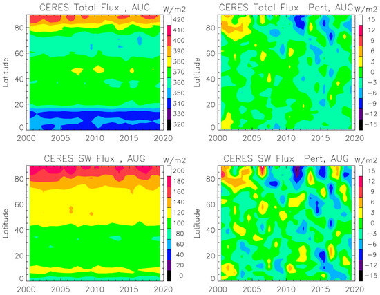 CERES top of the atmosphere (TOA) flux and perturbations of total (top panels) and SW (bottom panels) for the months of August in 2000–2019.