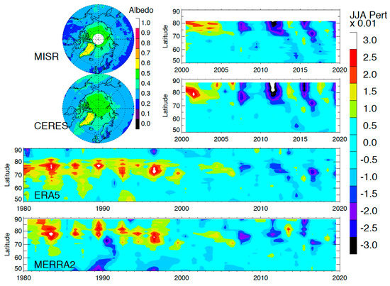 Figure 2, along with the time series of zonal mean albedo perturbations as a function of latitude from MISR, CERES, ERA5 and MERRA2. Both MISR and CERES observations reveal a similar TOA albedo distribution with the brightest over Greenland and Arctic sea ice. The CERES albedo over the Pacific and Atlantic is mostly from clouds, which is slightly brighter than MISR measurements. On the other hand, MISR albedo perhaps has slightly more variability over landmasses. A decreasing TOA albedo trend is clearly evident in both CERES and MISR JJA data at latitudes greater than 60°N where the Arctic change is dominated by the summer sea ice loss. The lowest Arctic albedo for JJA occurred in 2011 during the two-decade observation period. In addition, there is a strong interannual oscillation on the top of the trend, showing low albedos in 2008, 2011 and 2015 at these latitudes. It is noteworthy that these low-albedo years are one year ahead of the large mass loss anomalies over Greenland Ice Sheet (GrIS) in 2009, 2012 and 2016 [