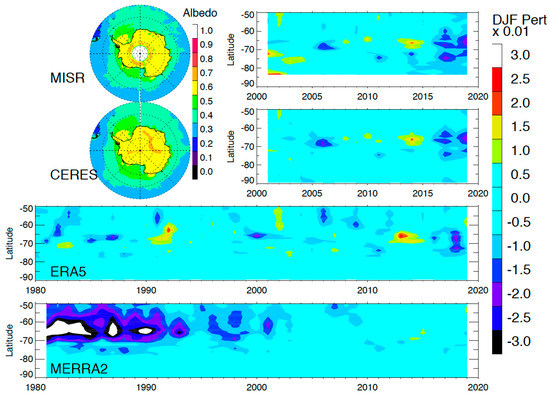 Figure 3). Both data sets reveal an albedo increase in 2013–2015 at 65°S, followed by a sharp reversal in 2016. While the 2013–2015 albedo increase is confined near 65°S, the reversal occurs over a wide range of latitudes between 60°–80°S. The 65°S latitude belt is where most of the Antarctic sea ice variability is seen. The dramatic decrease in Antarctic sea ice in 2016 has been intensively studied and attributed potentially to a number of factors including Southern Annular Mode (SAO) and Interdecadal Pacific Oscillation (IPO) [