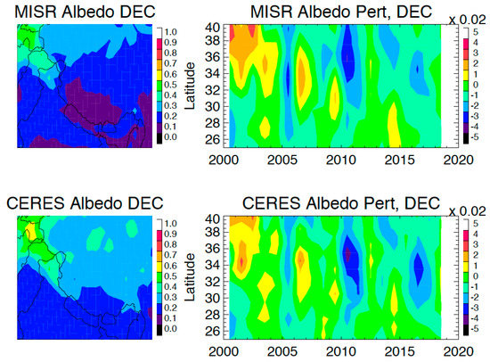 The CERES-MISR consistency is perhaps more striking in the observed interannual variations, as these observations have to overcome 3D effects of the complex terrain with very different techniques. December is the month when the largest albedo decreasing trend as well as year-to-year variations are observed by MISR and CERES during 2000–2019. The December oscillations reveal a low albedo in 2005, 2010, and 2016, with a period of ~5 years. The 5-year fluctuation is mixed with a quasi-biennial oscillation on the top of a decreasing trend, driving most of the December variabilities. HMA has the largest glacier and perennial snow cover concentration outside the polar regions. The TOA albedo over the TP and HMA is largely determined by the glacier and snow cover in the region. The MODIS snow cover variation (not shown) is found to be highly correlate with the TOA albedo oscillation seen in