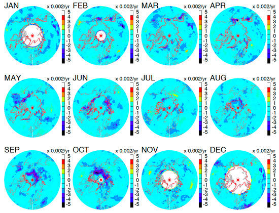 CERES albedo trend over the Arctic. The uncertainty from fitting is +/−0.002 yr−1 (2σ). The red contours represent the 80% monthly mean sea ice extent.