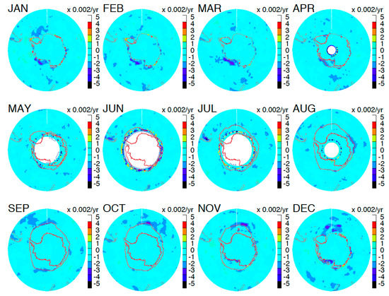 32]. During the summer months (e.g., February) the sea ice extent retreats near the coastal line (~67°S), whereas in the winter months (e.g., September) it expands to the latitudes of ~60°S. The decreasing trend over West Antarctica is quite persistent during November-April, which is consistent with the report from CryoSat-2 that the West Antarctic Ice Sheet (WAIS) is disappearing [