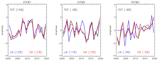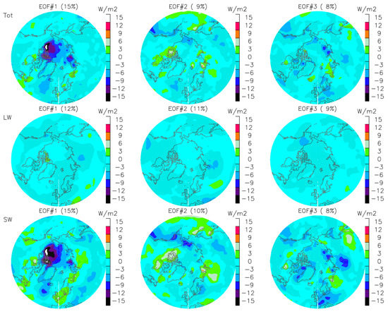 Leading three empirical orthogonal function (EOF) patterns of CERES TOA fluxes for JJA. The sum of three leading EOFs represents 32%, 32% and 33% of the total variance in total (TOT), LW, and SW fluxes, respectively.
