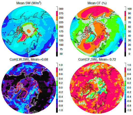 CERES mean TOA SW flux and cloud fraction (CF) distributions for JJA (top panels), and correlation maps between year-to-year variations in the LW and SW fluxes and between CF and SW (bottom panels) at latitudes of 40°N poleward. The red contour is the JJA mean sea ice extent at 80%. The regional mean correlation coefficients are indicated in the label of the bottom panels, showing dominated anti-correlation between LW and SW and positive correlation between CF and SW.