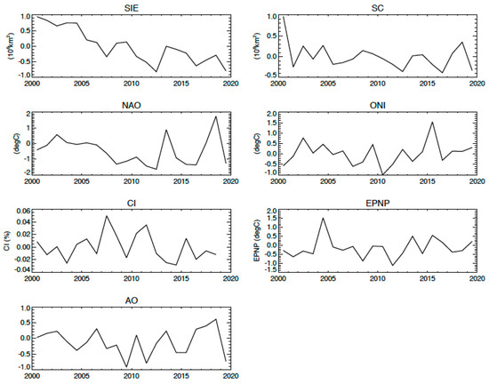 Major indices used in the correlation analysis for the Arctic TOA fluxes during JJA: Arctic sea ice extent (SIE), snow cover (SC), Northern Atlantic oscillation (NAO), oceanic niño index (ONI), mean 1° × 1° cloudiness index (CI) at 55°N–65°N latitudes, Pacific - North Pacific (EPNP), and Arctic oscillation (AO).
