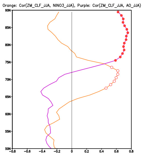Correlation between zonal mean CF and AO (purple) and ENSO (orange) in JJA as a function of latitude. Red and orange dots indicate statistical significance at the 95% confidence level.